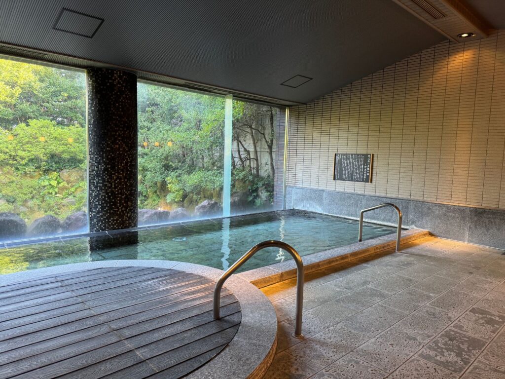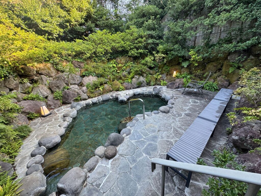 大浴場は、男女ともに露天風呂付きの同じ構造で、伊豆山温泉の「硫酸塩泉」を楽しめます。古くから湯治の地として愛されてきた温泉で、美肌効果のある弱アルカリ性のお湯です。広々とした空間は、気持ちいい!