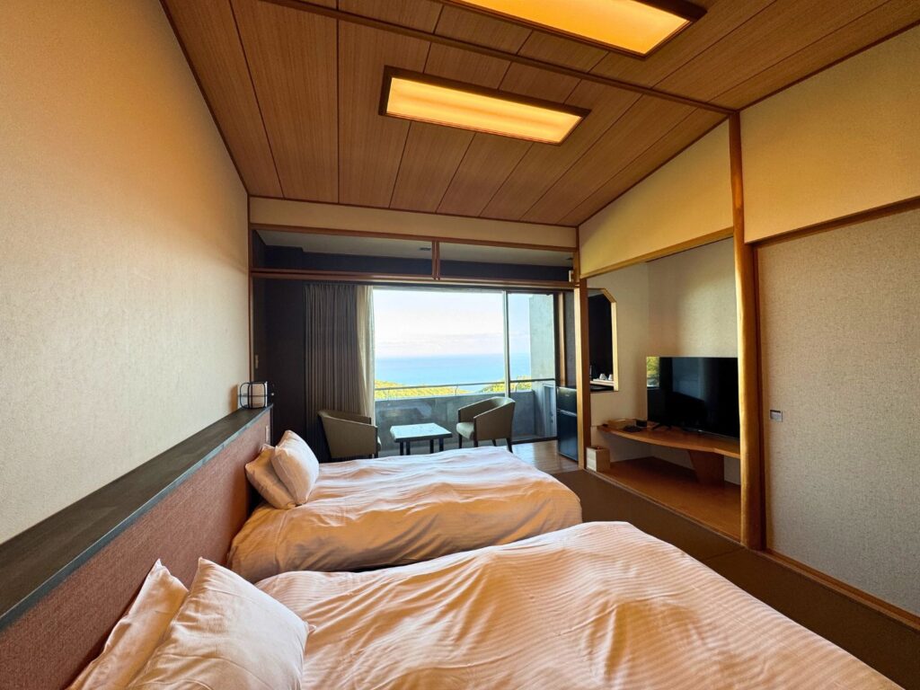 最も室数が多いのが「オーシャンビューコンフォート」(13室)。セミダブルサイズのシモンズベッドを2台配した洋室タイプで、定員は3名です。窓からは相模湾を一望でき、特に晴れた日は初島も見えるそうです。