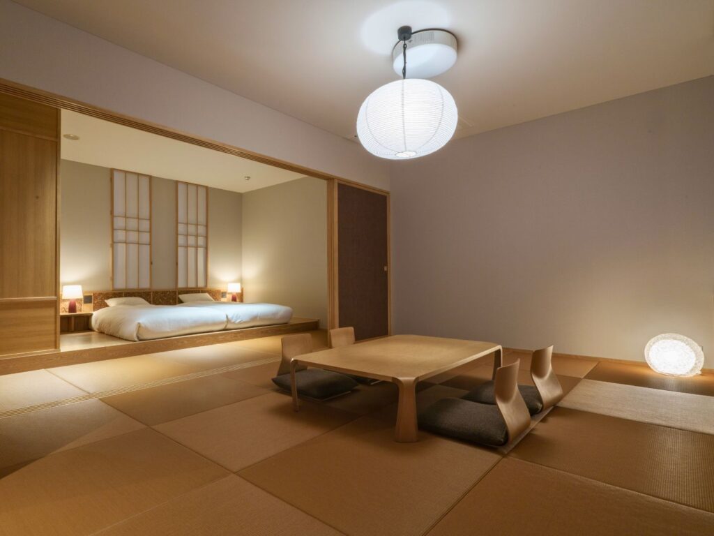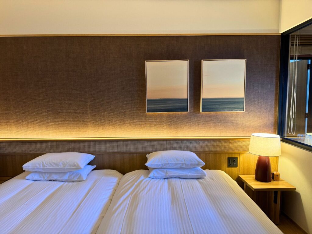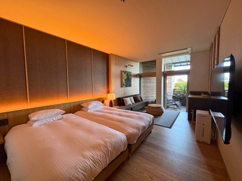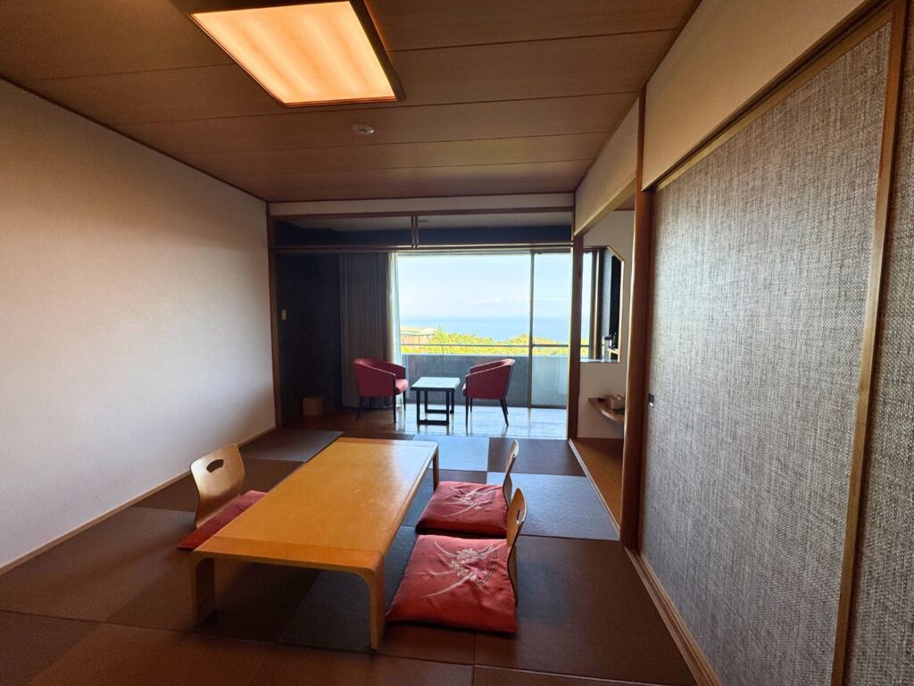 和室タイプの「オーシャンビュージャパニーズルーム」は、和室8畳にセミダブルサイズのベッド2台を設置したお部屋。最大5名まで宿泊可能で、女子旅やグループ旅行に人気とのこと。どちらのお部屋も落ち着いた雰囲気でした。