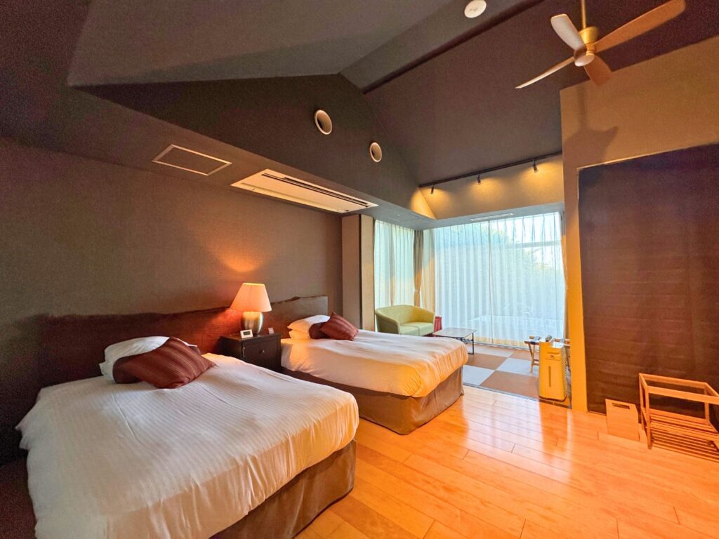 セミダブルサイズのシモンズベッドを2台配した洋室タイプ。14平米のテラスには3名でも入れるバレルサウナと、露天風呂・整い椅子を設置しています。お部屋からの眺望も素晴らしく、サウナ好きにはたまらない客室です。