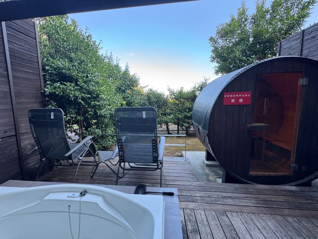 最上級のスイートルームは、定員6名の広々としたお部屋。22平米のテラスには4名でも広々入れるバレルサウナと露天風呂、整い椅子を設置しています。120インチのプロジェクターも完備で、グループでの宿泊にも最適です。夜通し大人数でも楽しめそうなお部屋でした!