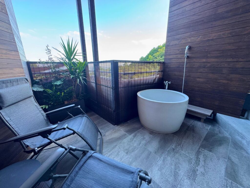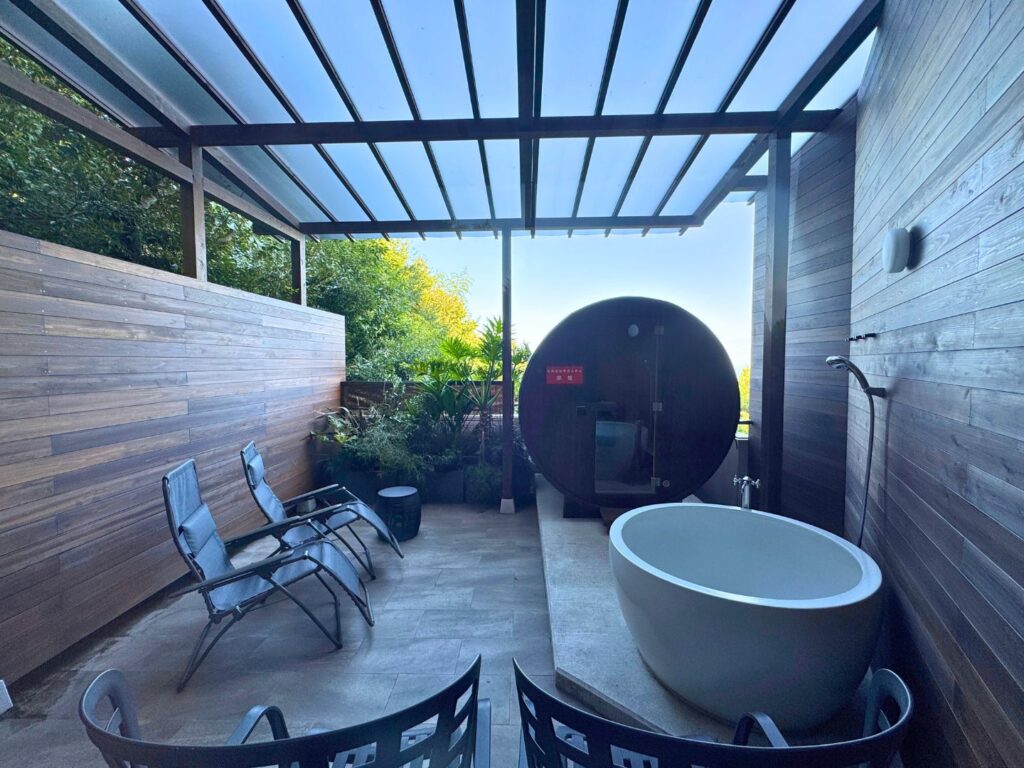 上から2番目のスイートルームで、定員4名のお部屋です。23平米の広々としたテラスには、4名でもゆったり入れるバレルサウナと露天風呂、整い椅子を完備。浴槽に水を張って冷やすこともできるそうです。