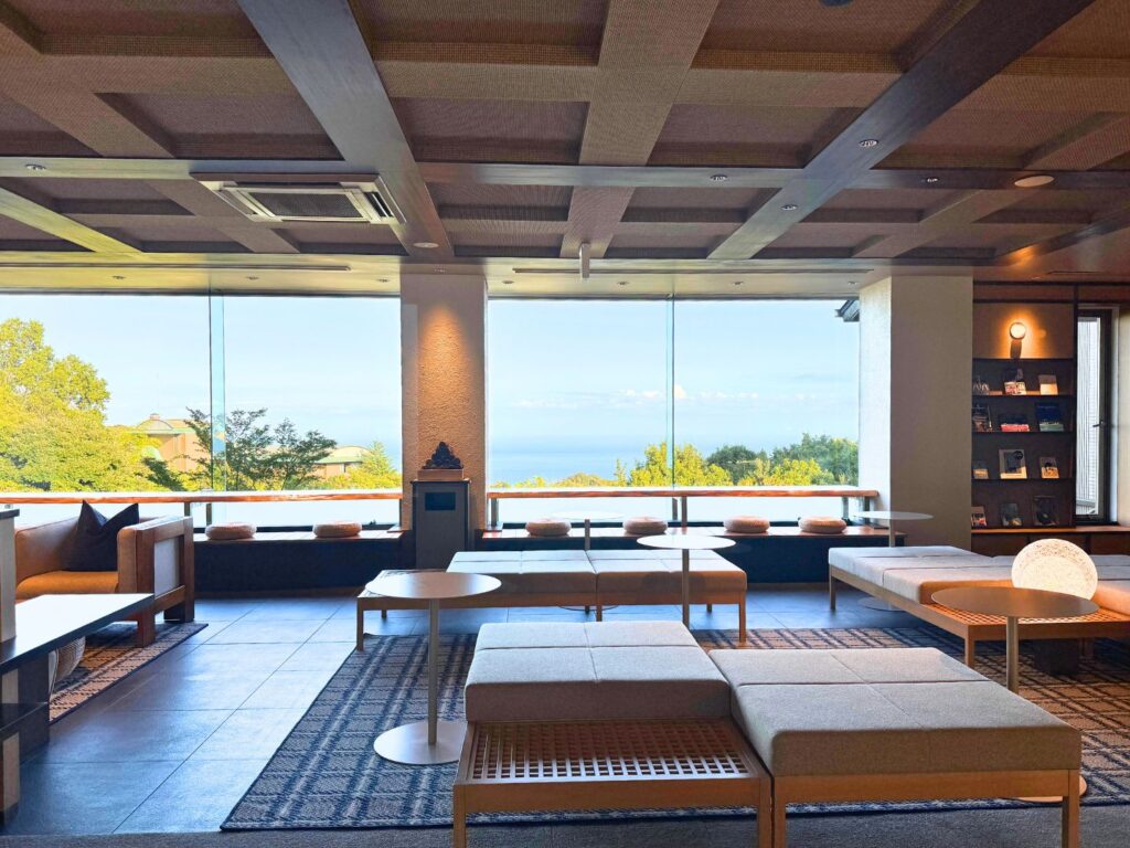 館内に足を踏み入れると、まず目に飛び込んでくるのが大きな窓から見える相模湾の絶景です。これだけで、テンションがあがってしまいます! さらに、ヒノキ、ジュニパー、ラベンダーを調合したという、オリジナルの香りにも包まれてうっとり。視覚も嗅覚も刺激されます。