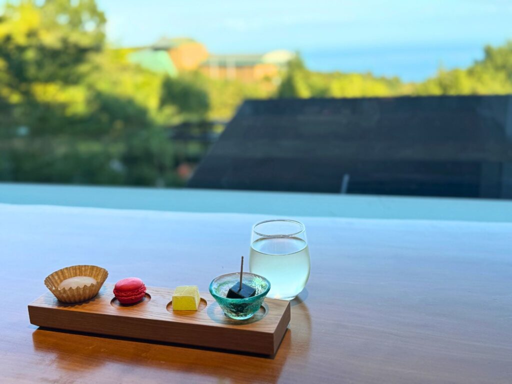 チェックイン後のお楽しみは、ここでいただけるウェルカムアフタヌーンティー。抹茶のシフォンケーキ、わらび餅、いちごのマカロン、生クリーム大福など、一口サイズの色とりどりのスイーツが並びます。足湯に浸かりながら、目の前に広がる海を眺め、甘いものをいただく…という贅沢な時間を過ごせました。